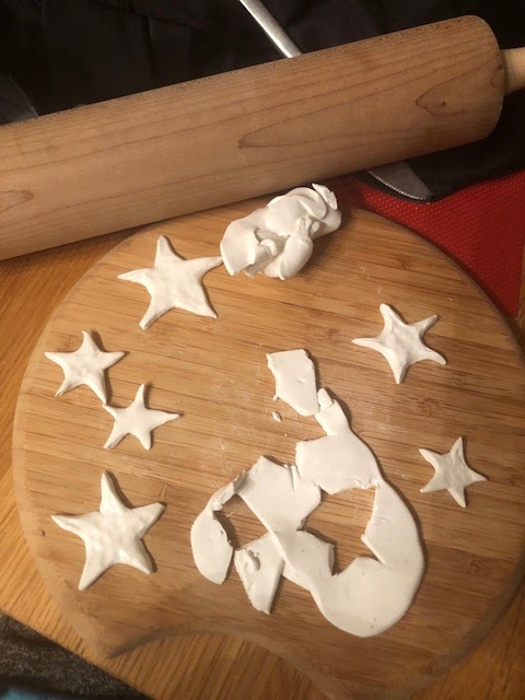 (material: little brown drawer -a lucky found on the street!-, paper macher for mom and baby and moon, modeling paste for the stars, and lots of glue!)